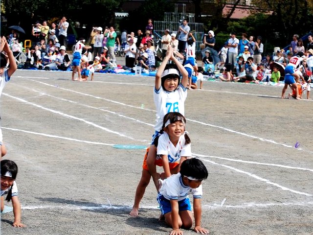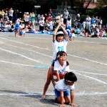 年長さんの大空くん、元気いっぱいに運動会を楽しんでいる様子。くす玉割り、親子競技、組体操(写真:スカイツリー?)、綱引き、鼓隊パレード・演奏、リレーと数多くの競技に真剣に取り組んでいた。普段は親・兄弟との生活しか見られないが、我が孫も少しずつ仲間に入って集団での行動に馴染めるようになってきているようだ。